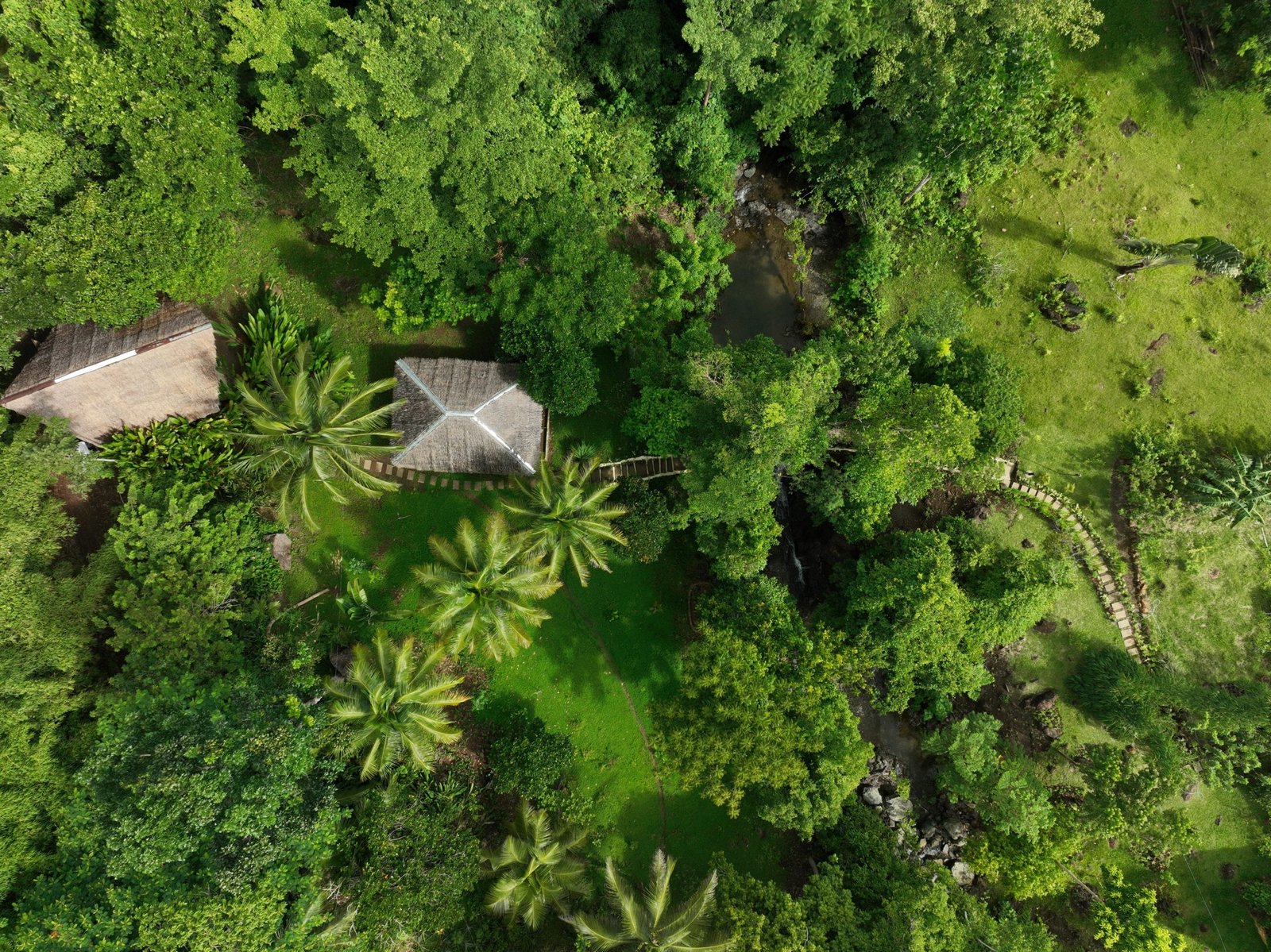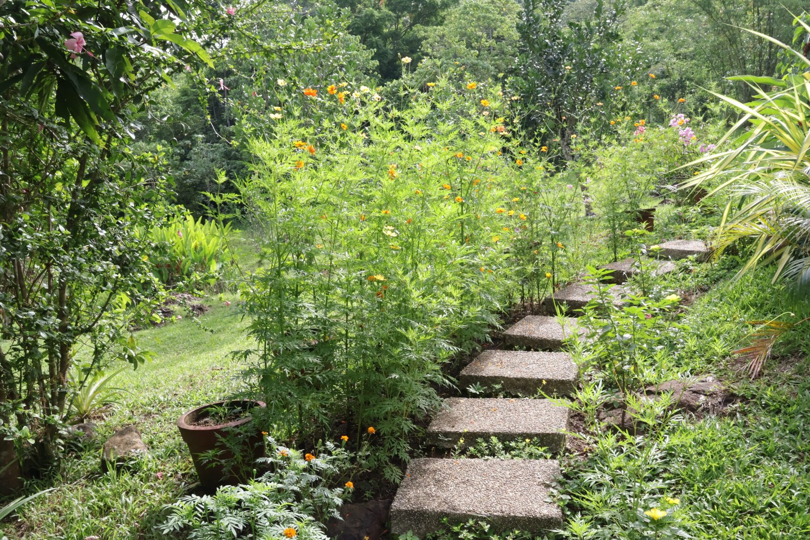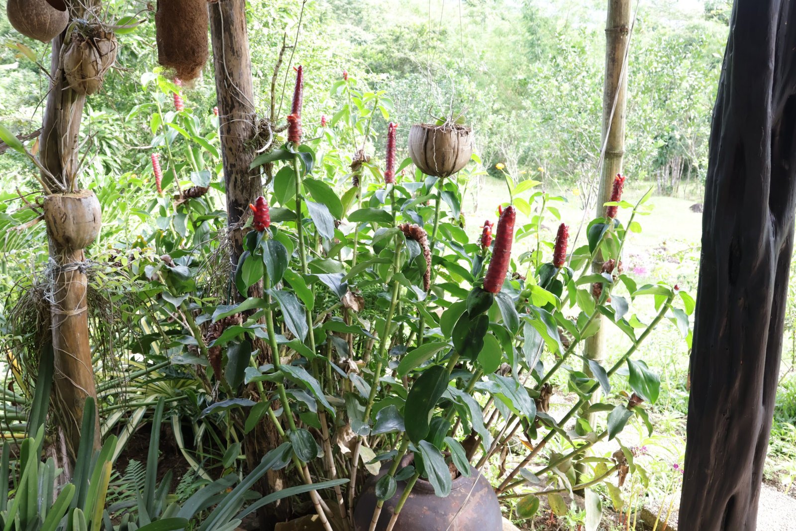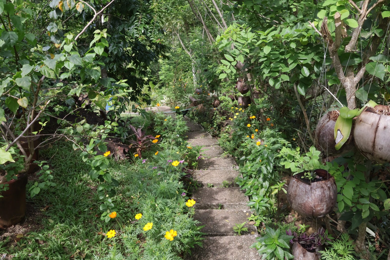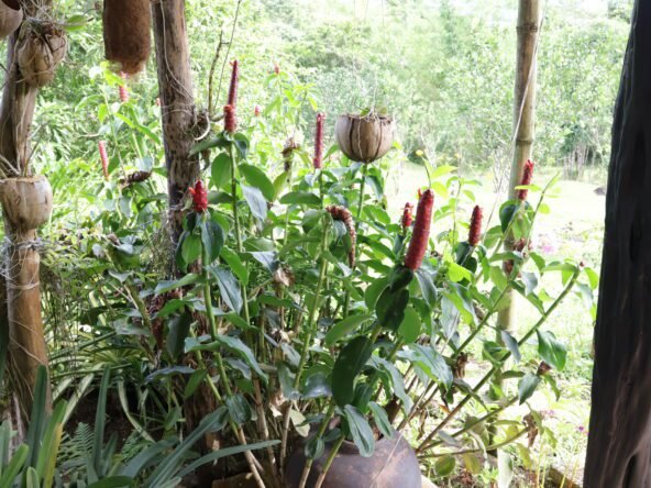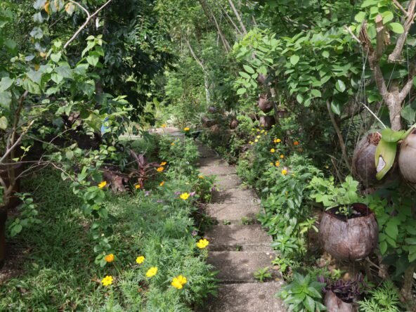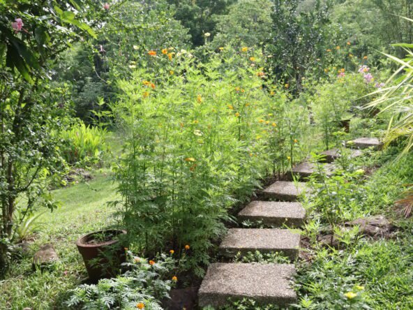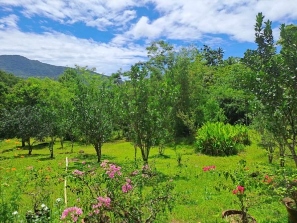 The property boasts a rich variety of fruit trees, including coffee, cacao, pineapple, coconut, banana, mango, avocado, and more. Additionally, there are hardwood trees like mahogany, narra, and giant bamboo. The herb and flower gardens add to the natural beauty with various aromatic herbs and colorful blooms.